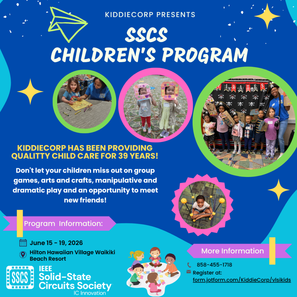 We are excited to announce that SSCS Women in Circuits will be providing child care at VLSI 2026 through KiddieCorp! Our goal is to provide your children with a program they want to attend, while giving you the critical “peace of mind” to attend sessions and events during the 2026 IEEE/JSAP Symposium on VLSI Technology & Circuits. KiddieCorp is in its thirty-ninth year of providing high-quality children’s programs and youth services to conventions, trade shows, and special events. We take caring for your children very seriously. KiddieCorp has enjoyed a long-time partnership with the American Academy of Pediatrics, which has helped to establish KiddieCorp as a premier provider of event children’s program services.